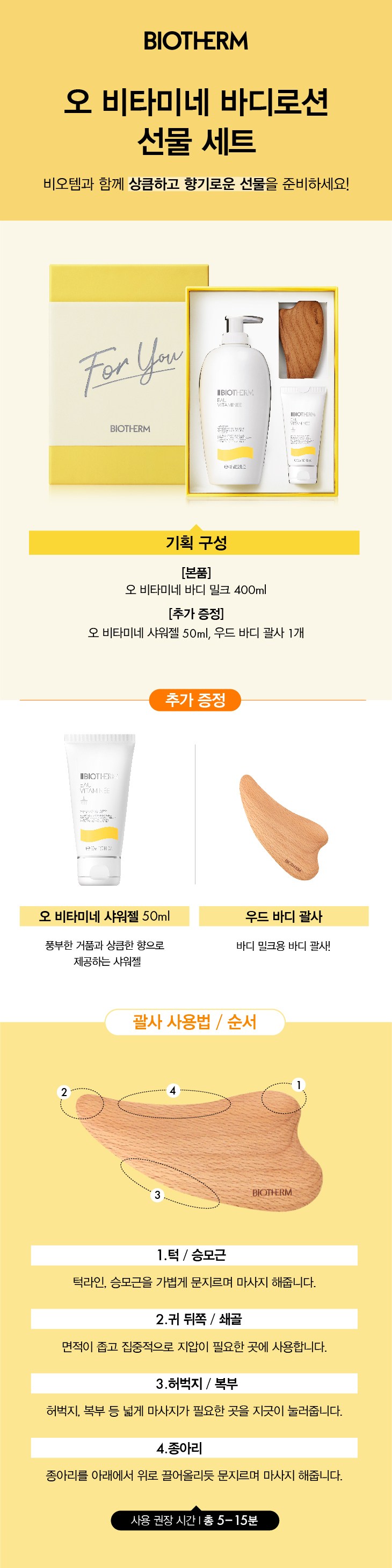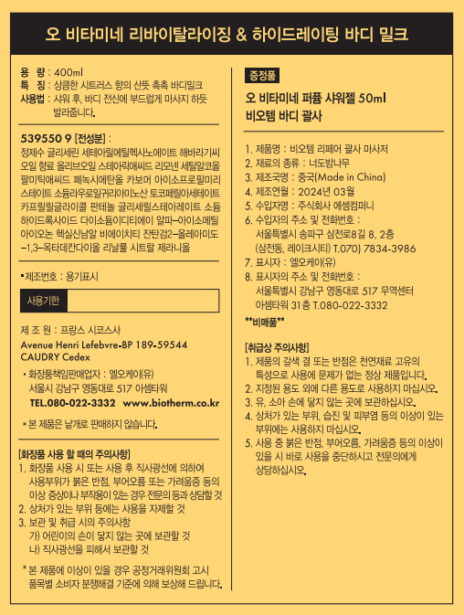오 비타미네 바디 밀크 400ml +샤워젤 50ml + 바디괄사 기프트 세트 요약정보 및 구매